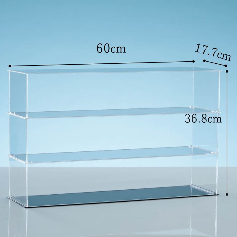 < 商品仕様 > 【基本セット】 ・アクリルケース3個 ・ベース1枚 (ズレ止め8個付き) < サイズ > 幅600mm×奥行177mm×高さ368mm ※寸法は外寸で、3段重ねた場合です 【追加用ケース】 「基本セット」の追加ケースとして重ねてお使いいただけます ※「追加」のご注文は、ケース1個ずつのご注文となります ・アクリルケース1個 (ズレ止め4個付き) < サイズ > 幅600mm×奥行177mm×高さ122mm ※寸法は外寸です < 納期 > ご注文・ご入金確認後6営業日(土日祝・臨時休業等除く)以内に出荷いたします ※6日以内ではありません ※大量注文の場合は、表記に関わらず納期ご相談となります ※お急ぎの方はご注文前にご相談ください < お手入れ方法・その他 > 汚れた場合や、静電気の抑え方はこちら