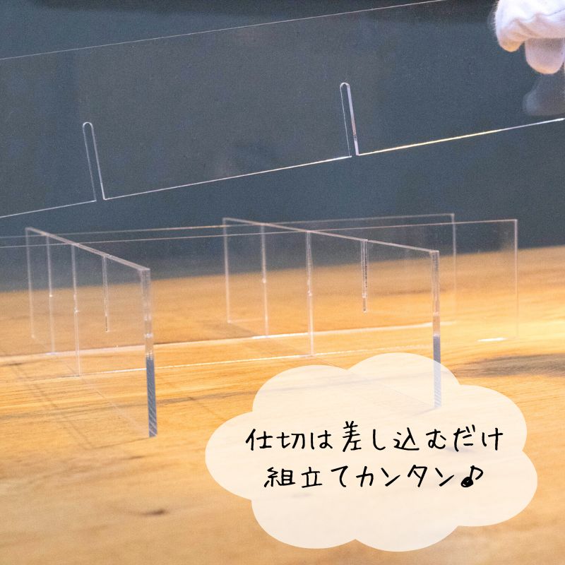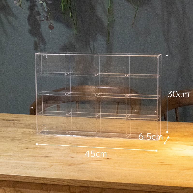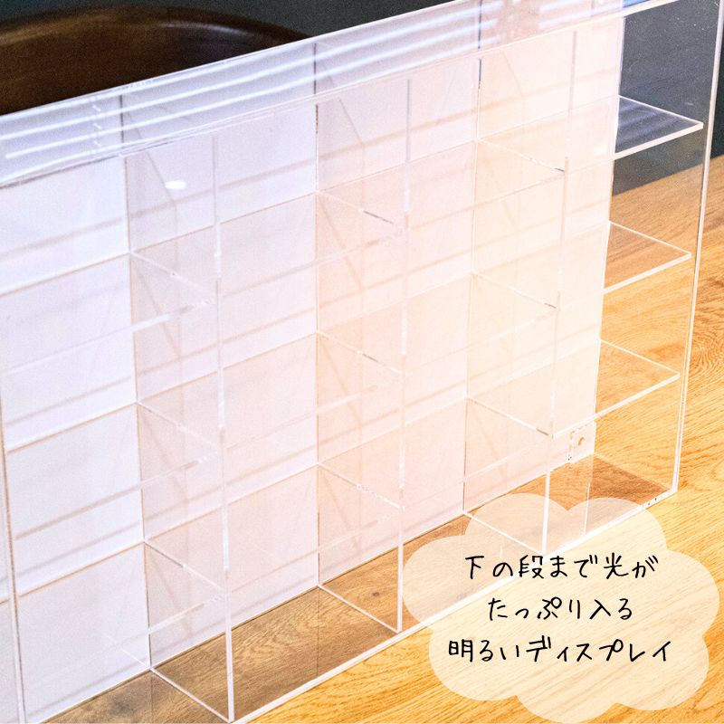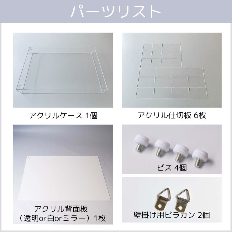 ・奥行が小さく省スペース ・紫外線による劣化・変退色を軽減 ・付属の金具を付けて、壁掛けも可能です ・食玩やカプセルトイなどの小さなフィギュアを飾ることが出来ます ・正面板・フレーム・棚板が高透明のアクリルなので光がたっぷり入ります ・高透明アクリル仕様で光が入るので下段に飾ったものも暗くなりません ・背板付きなので、ホコリをシャットアウトします < セット内容 > ・アクリルケース 1個 ・アクリル仕切板 6枚 ・アクリル背面板(透明またはホワイトまたはミラー) 1枚 ・ビス 4個 ・壁掛け用ビラカン 2個 < 商品仕様 > < サイズ > 幅 450mm 奥行 65mm 高さ 300mm < 1マス内寸 > 幅 約108mm 奥行 約60mm 高さ 約71mm < 板厚 > 背面板 2mm 他 3mm < 仕様 > 仕切板をマス目に設置して、背面からオブジェを並べます。 最後に背板をビスで留めて完成です。 ※前板があるので、正面からオブジェを出し入れすることはできません < 納期 > ご注文・ご入金確認後6営業日(土日祝・臨時休業等除く)以内に出荷いたします ※6日以内ではありません ※大量注文の場合は、表記に関わらず納期ご相談となります ※お急ぎの方はご注文前にご相談ください < お手入れ方法・その他 > 汚れた場合や、静電気の抑え方はこちら < 関連商品 > >5×4マス目コレクションケース