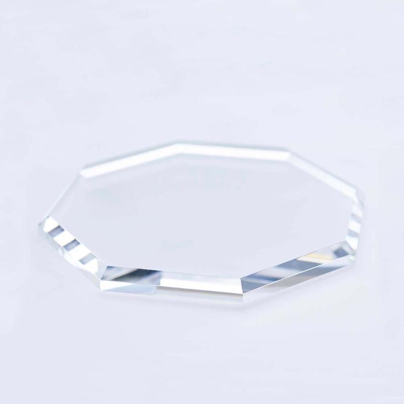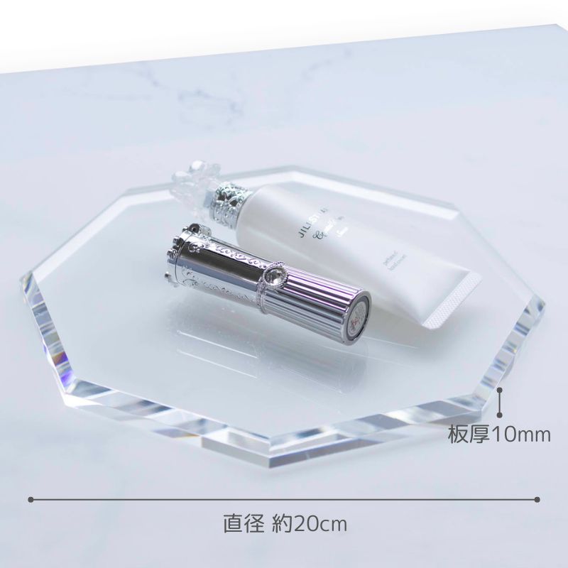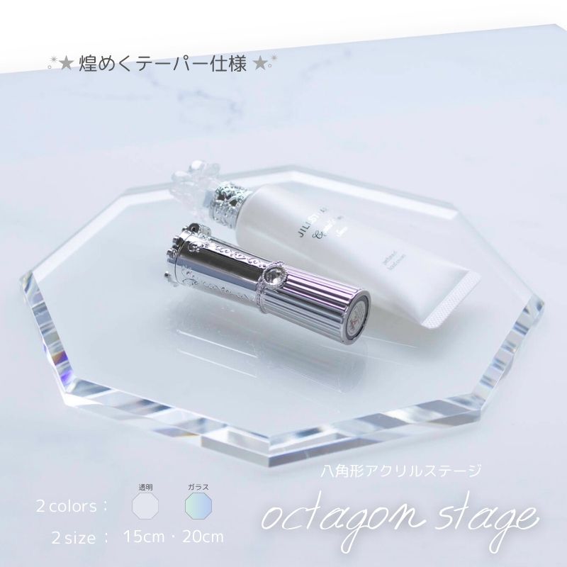 光を集めるテーパー仕上げ ◆商品展示や作品展示に ◆小物撮影に ~made in Japan~ 神奈川県の自社工場でアクリル板から切り出して、職人が1つ1つ手作業で研磨しております。 切断面をダイヤモンドの刃を利用した鏡面加工機で磨いているので、歪みがなく透明度も高い仕上がりになっております。 型に流して作る成型品では味わえない高級感があります。 < 関連商品 > テーパー(斜めカット)無しタイプはこちら >八角形アクリルステージ < ノーマル > < 商品仕様 > < サイズ > ・直径 約15cm ・直径 約20cm < 板厚 > ・透明 10mm ・ガラス色 8mm < お支払方法 > 代金引換はご利用いただけません。 < 納期 > ご注文・ご入金確認後7営業日(土日祝・臨時休業等除く)以内に出荷いたします ※7日以内ではありません ※大量注文の場合は、表記に関わらず納期ご相談となります ※お急ぎの方はご注文前にご相談ください < お手入れ方法・その他 > 汚れた場合や、静電気の抑え方はこちら