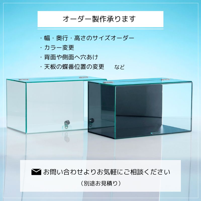 ・車・飛行機・船などの大型模型の展示に ・雛人形・五月人形などの日本人形の展示に ・開閉姿が美しいウイング式の扉 ・扉のL字部分はツヤが綺麗な曲げ加工仕上げ ・付属の背面ミラーでコレクションの後ろ姿も楽しめる ・カラーバリエーション豊富 < オーダー製作 > サイズオーダーも承っております。 お問い合わせよりお気軽にご相談ください。 < 商品仕様 > < サイズ > 幅45cm×奥行30cm×高さ30cm < カバー部(扉・天板・側板)カラー > ・透明 ・ガラスカラー < 背板・底板カラー > ・透明 ・ガラスカラー ・ホワイト(ツヤあり) ・ブラック(マット) < カギ > 有り・無し ※カギ無しはツマミ付き < 背面ミラー > 背面ミラー1枚付き(脱着可能) < 蝶番 > 2個 < セット内容 > ・アクリルウイング式コレクションケース 1台 ・内部背面用ミラー(両面テープ付) 1枚 ※カギ有りご購入の場合 ・カギ 2本 < 納期 > ご注文・ご入金確認後7営業日(土日祝・臨時休業等除く)以内に出荷いたします ※7日以内ではありません ※大量注文の場合は、表記に関わらず納期ご相談となります ※お急ぎの方はご注文前にご相談ください < お手入れ方法・その他 > 汚れた場合や、静電気の抑え方はこちら