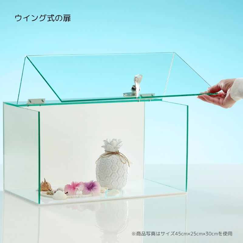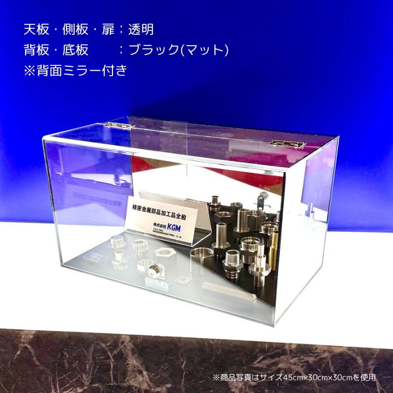 ・車・飛行機・船などの大型模型の展示に ・雛人形・五月人形などの日本人形の展示に ・開閉姿が美しいウイング式の扉 ・扉のL字部分はツヤが綺麗な曲げ加工仕上げ ・付属の背面ミラーでコレクションの後ろ姿も楽しめる ・カラーバリエーション豊富 < オーダー製作 > サイズオーダーも承っております。 お問い合わせよりお気軽にご相談ください。 < 商品仕様 > < サイズ > 幅60cm×奥行25cm×高さ25cm < カバー部(扉・天板・側板)カラー > ・透明 ・ガラスカラー < 背板・底板カラー > ・透明 ・ガラスカラー ・ホワイト(ツヤあり) ・ブラック(マット) < カギ > 有り・無し ※カギ無しはツマミ付き < 背面ミラー > 背面ミラー1枚付き(脱着可能) < 蝶番 > 2個 < セット内容 > ・アクリルウイング式コレクションケース 1台 ・内部背面用ミラー(両面テープ付) 1枚 ※カギ有りご購入の場合 ・カギ 2本 < 納期 > ご注文・ご入金確認後7営業日(土日祝・臨時休業等除く)以内に出荷いたします ※7日以内ではありません ※大量注文の場合は、表記に関わらず納期ご相談となります ※お急ぎの方はご注文前にご相談ください < お手入れ方法・その他 > 汚れた場合や、静電気の抑え方はこちら