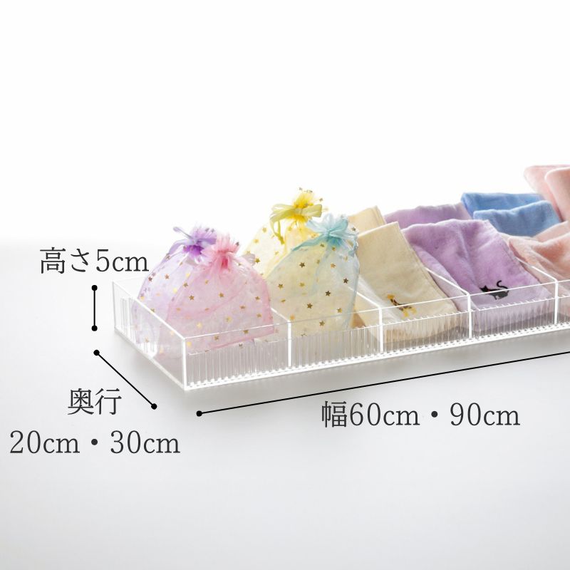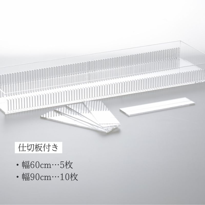 細かな商品陳列に最適な仕切板付き。 仕切板を差し込み、幅を自由に調節できます。 ~made in Japan~ 神奈川県の自社工場でアクリル板から材料を切り出して、職人が一点一点丁寧に製作しております。 安価なプラスチック成型品では味わえない、透明感と美しい光沢が味わえます。 < 商品仕様 > < サイズ > 幅60cmx奥行20cmx高さ5cm 備品:仕切板5枚付 幅60cmx奥行30cmx高さ5cm 備品:仕切板10枚付 幅90cmx奥行20cmx高さ5cm 備品:仕切板10枚付 幅90cmx奥行30cmx高さ5cm 備品:仕切板10枚付 < カラー > 透明 < 素材 > アクリル < 納期 > ご注文・ご入金確認後7営業日(土日祝・臨時休業等除く)以内に出荷いたします ※7日以内ではありません ※大量注文の場合は、表記に関わらず納期ご相談となります ※お急ぎの方はご注文前にご相談ください < お手入れ方法 > 汚れた場合や、静電気の抑え方はこちら < 関連商品 > >ビニングボックスAタイプ >ビニングボックスBタイプ >仕切板 追加購入 < オーダー製作 > サイズオーダーも承っております。 お問い合わせよりお気軽にご相談ください。